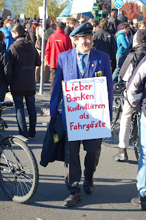 liberadio, конечно, понимает, что среди протестующих было полно людей, для которых эти убогие требования наказания всяких «жадных менеджеров» и «безответственных политиков» и «обуздания финансового капитала» были просто пределом критики, ибо о других пределах им до сих пор слышать не приходилось; для которых эти массовые протесты были просто уникальным опытом более-менее «прямого» политического протеста, ибо политический и профсоюзный ландшафт ФРГ умиротворён донельзя. Но в целом, liberadio теряется в догадках, как относиться к протестным маршам этих «истовых демократов». То ли смеяться, то ли ховаться в страхе и ужасе. Все эти пожелания прямого и скорого возмездия – если не тюрьмой, то линчеванием на фонарном столбе — способны повергнуть одарённых рассудком, как минимум, в лёгкий шок.
